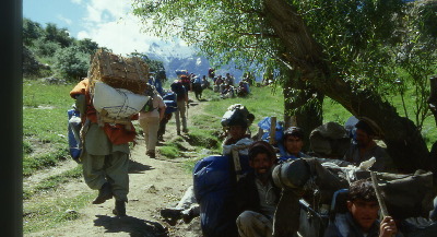 Es dauert beinahe bis 10.00 Uhr, bis wir abmarschbereit sind. Die 80köpfige Begleitmannschaft von Guides, Köchen, Hilfspersonal und etwa 70 Trägern gilt es zu organisieren und mit gleichmäßig schwerem Gepäck auszustatten. Die Träger waren in den letzten Tagen große Distanzen von den umliegenden Dörfern bis hierher gelaufen, nach Askole, dem letzten bewohnten Ort vor der Einsamkeit der Bergwelt. Es sind abenteuerliche Gestalten darunter. Es wird gespuckt und gerotzt, die Kleidung hängt in Fetzen, die Füße stecken in meist viel zu großen, knöchelhohen Gummischuhen.
