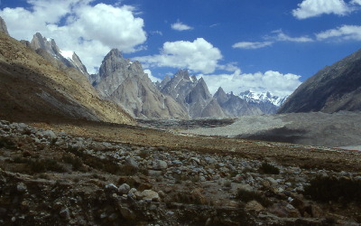 Unsere Blicke richten sich in den wenigen kurzen Pausen auf Berggestalten, die sprachlos machen. Da stehen sie, die "Wächter des Baltoro", mit Namen, die Klang haben in der Szene: Biaho Tower, die Trango Towers (5700m), kleine und große Kathedrale (5800m), Lobsang, Paiju Peak und ganz in der Ferne erstmals ein Achttausender, der Broad Peak. Bis zu zweieinhalbtausend Meter ragen sie über dem Gletscher auf. Geschlossene, glattgeschliffene Granitwände, oft senkrecht, höher als die höchsten Steilwände in den Alpen.