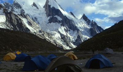 Die Wanderung nach Chuspany dauert noch einige Stunden und eröffnet uns durch die mittlerweile müden Augenlider Blicke auf den überwundenen Pass. Am frühen Nachmittag erreichen wir unser Lager nach gut 14stündigem Marsch. Das Camp Chuspany liegt traumhaft an einer Alm, die mit den herrlichsten Blumen und Kräutern bewachsen ist. Welch eine Wonne für unsere auf Eiswüste und Gestein geeichten Augen. Der Nachmittag dient zum Relaxen, sortieren der Ausrüstung, waschen im vorbeifließenden Gletscherbach und trinken von Coca Cola, die es zu einem Wucherpreis zu kaufen gibt. Aber egal, eine tolle Abwechslung zum Grünen Tee oder Mineraltrunk.