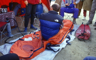 Als aktionistischer Höhepunkt unseres Faulenztages, demonstriert uns Ralph die Funktion des lebensrettenden Luftdrucksackes. Einen höhenkranken Bergsteiger kann man in dieser Kammer durch Aufblasen und Druckerhöhung um ca. 2000 Meter "herunterbringen", was sein Leben retten könnte. Ich bin hin- und hergerissen zwischen dem Betrachten unseres freiwillig Höhenkranken und den in Scharen herbeigelaufenen Zuschauern aus Baltistan.