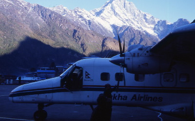 Der nur 35minütige Flug nach Lukla ist wohl einer der spektakulärsten Linienflüge der Welt. Mit einem atemberaubenden Blick auf die Berge beginnt das Spektakel. Kurz vor der Landung wird ein etwa 4200 Meter hoher Pass beinahe gestreift, um danach in das enge Tal des Dudh Khosi einzuschwenken. Die erst seit einigen Jahren asphaltierte Landepiste ist extrem kurz und endet sprungschanzentischähnlich direkt vor einer riesigen Felswand.