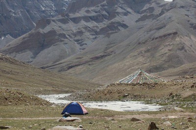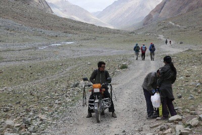 Nach dem Pass wird es flacher und der Pfad mündet in einer Schotterpiste. Bis hierhin können Fahrzeuge von Hilsa fahren. Die Strasse wird sicherlich auch noch verlängert. Es geht jetzt durch Weidelandschaften vorbei an Palbang und tibetischen Zeltortschaften, die die Strassenbauarbeiter beherbergen.