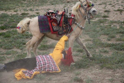 Wenige Serpentinen später eine zweite, nicht minder interessante Aktion. Ein Pferdewettrennen mit Geschicklichkeitsspielen hat mehrere hundert Schaulustige angelockt. Soldaten mit Schild und Schlagstock sind dabei und sollen ein mögliches "Aufbegehren" der Leute unter Kontrolle bringen. Tondrup fragt das Militär, ob wir fotografieren dürfen. Ja, außer den Soldaten.