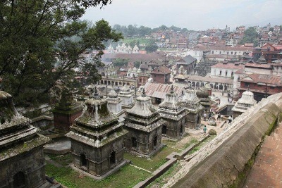 In der Ferne sieht man bereits die Silhuette der Hindustätte; es hat mächtig Qualm, d.h. es finden derzeit viele Verbrennungen statt. Der Bagmati gilt als ein heiliger Fluss, der die sterblichen Überreste der Verstorbenen in den Ganges spült. Eine notwendige Bedingung zu einer guten Wiedergeburt.