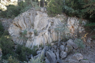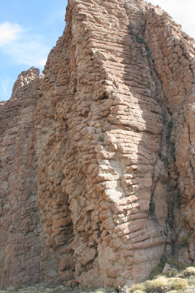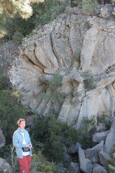 Hier muss bei einem mächtigen Lavastrom der Erkaltungsprozess diese kristallinen Formen erzeugt haben. Je nach Temperaturgefälle des Magmas und dem Neigungswinkel des Geländes entstehen diese Rosetten, oder im Falle des Weglaufens der noch flüssigen Lava zum Inneren der Fließrichtung hin, die sogenannten Lavatunnel.