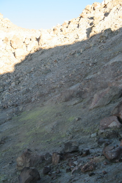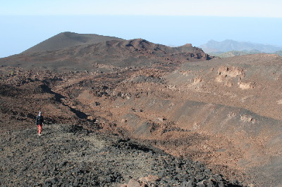 Bis auf 3 Spanier, die die gleiche Idee wie wir hatten, sind wir ganz alleine in dem nach Schwefel stinkenden Inneren des Kraters. Der Ausblick auf die Insel und die Nachbareilande ist phänomenal. Wir können uns im Windschatten des Kraterrandes an der Szenerie in aller Ruhe sattsehen.